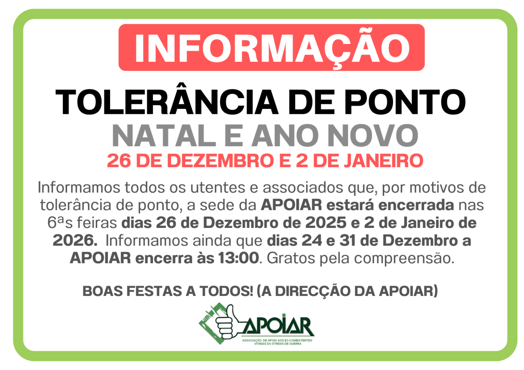 Tolerância de Ponto Natal e Ano Novo Posted on 9 Dezembro, 202519 Dezembro, 2025 by apoiar TOLERÂNCIA DE PONTO NATAL E ANO NOVO A APOIAR estará encerrada nos dias 26 de Dezembro de 2025 e 2 de Janeiro de 2026. Nos dias 24 e 31 de Dezembro encerrará às 13:00. Gratos pela compreensão. BOAS FESTAS A TODOS! A APOIAR